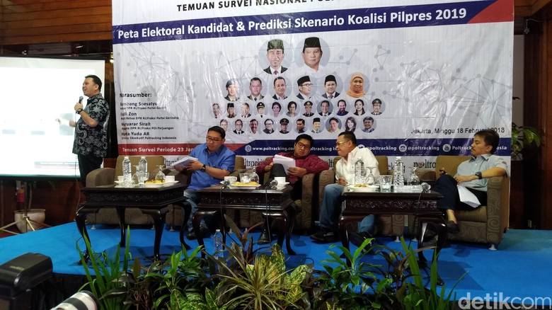 Ini adalah hasil survei Poltracking Indonesia bertajuk 'Proyeksi Skenario Peta Koalisi Pilpres 2019', dirilis di Hotel Sari Pan Pacific, Jl MH Thamrin, Jakarta Pusat, Minggu (18/2/2018).